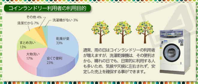 雨の日の洗濯物を乾かしたい、マンション等で騒音が気になる、大量の洗濯物を短時間で効率良く仕上げ、時間の有効活用したいなど、忙しい主婦の味方になるコインランドリーは今注目を浴びる事業です。